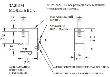 В комплект зажима BC-2 входит зажим для крепежа на балках и перекладинах, угловой зажим WAW и кнопочная защелка. Этот универсальный зажим может использоваться для монтажа термокабеля на кабельных лотках, конвейерах, монтажных уголках, I-балках, балочных перекрытиях и т.п. Материал - сталь.