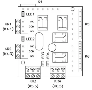 Клеммные колодки KR платы Gate-Relay соответствуют номеру дополнительного реле и контактам дополнительных выходов контроллера Gate-8000:- KR1 - доп.реле 1 - выход K4.1 на плате контроллера.