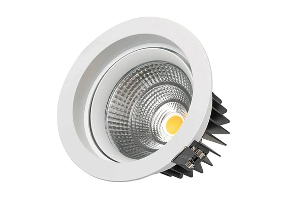 Встраиваемый круглый светильник с наклоняемой осью, угол 30° / 25Вт, цвет свечения (в зависимости от модификации) Теплый белый 3000K - световой поток 1950лм, Дневной белый 4000К- световой поток 1950лм, светодиод 1x25W CREE. Белая лицевая панель. Питание AC110-240V, драйвер в комплекте 600mA 34-50V). Размеры DxH: 150х115мм, отверстие для установки 128мм.
