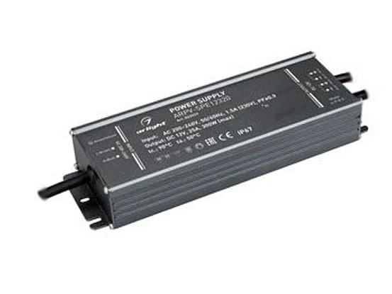 Блок питания, 300Вт, герметичный, для светодиодных изделий. Алюминиевый корпус IP67. Габариты L225xW73xH38 mm. Вход. напряж-е 200-240V AC, выход 12V DC +-3%, коэффициент мощности PF>0,9. Диапазон раб. темп. -40..+50 С. Гарантия 5 лет