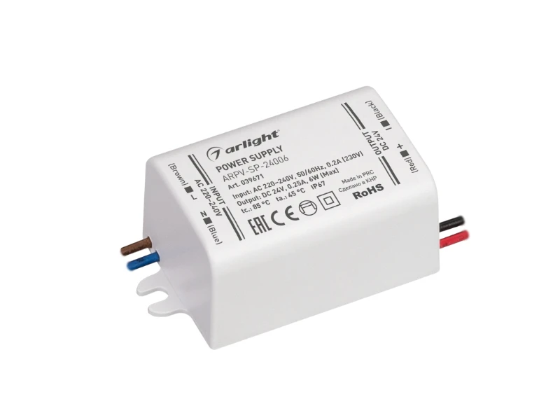 Источник напряжения с гальванической развязкой для светодиодных изделий. Входное напряжение 220-240 VAC. Выходные параметры: 24 В - 0.25 А, 12 В - 0.5 А, 6 Вт, PF >0.5. Герметичный пластиковый корпус IP 67. Рабочая температура -20…+45C⁰. Габаритные размеры длина 55 мм, ширина 29.5 мм, высота 22 мм. Гарантийный срок 5 лет.