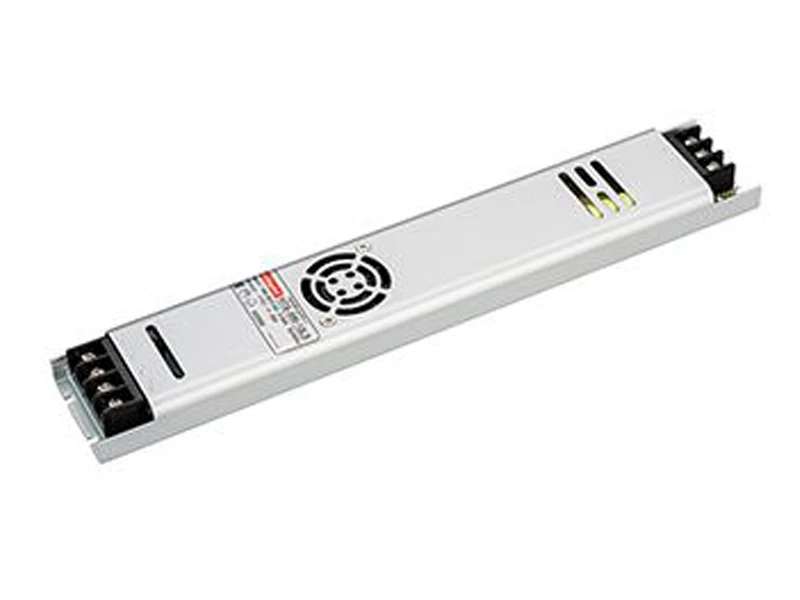 Ультратонкий и узкий блок питания с вентилятором для лайтбоксов, входное напряжение 180-264VAC, выход в зависимости от модификации 12 или 24V, 12,5-25A, мощность 300W, размеры 308x53x21 мм. Гарантия 2 года