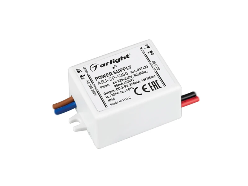 Источник тока с гальванической развязкой для светильников и мощных светодиодов. Входное напряжение 100-240 VAC. Выходные параметры: 3-9 В, 350 mА, 4 Вт. Встроенный PFC >0.4. Негерметичный пластиковый корпус IP 20. Габаритные размеры длина 48 мм, ширина 27 мм, высота 20 мм. Гарантийный срок 5 лет.