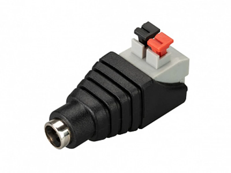 Одна сторона - клеммная колодка самозажимная для провода (от ленты), другая сторона - DC-вход 5.5 мм (мама) для штекера от сетевого адаптера.