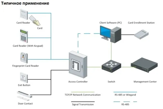 - Интерфейс Wiegand поддерживает W26, W34 и совместим со сторонним считывателем карт с интерфейсом Wiegand
