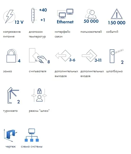 - до 8 считывателей по интерфейсу RS-485 или Wiegand (при использовании конвертера интерфейса)