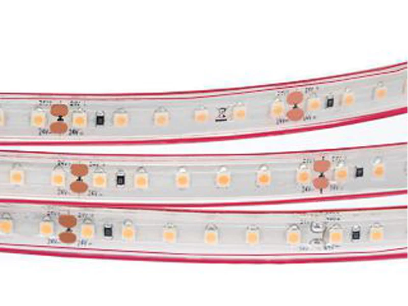 Герметичная IP67 (плата в силикон.трубке) гибкая лента LUX, светодиоды 2X smd 3528, 120шт/м (600шт на 5м), белая плата 8мм, скотч 3М. Цвет ТЕПЛЫЙ БЕЛЫЙ 3000-3200K. Питание 24В, мощность 9,6 Вт/м (48 Вт на 5м), угол 120°. Размеры 5000х11х5мм. Цена за 1м.