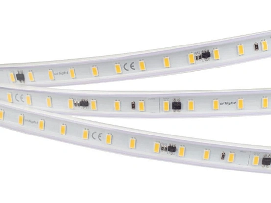 Герметичная IP65 (в PVC трубке, тип WP2) лента AC230V, светодиоды smd 5630, 72шт/м (3600шт на 50м), без скотча, крепление на скобы или профиль (не входят в комплект). Цвет Дневной белый 3800-4300K. Питание 230V, мощность 14 Вт/м (700 Вт на 50м), угол 120°, цветопередача CRI>80. Размеры 50000х15.5x6мм. Мин.отрезок 166.67мм, 12 шт светодиодов. Пакет 50м. В комплекте: заглушка и провод питания. Цена за 1м.