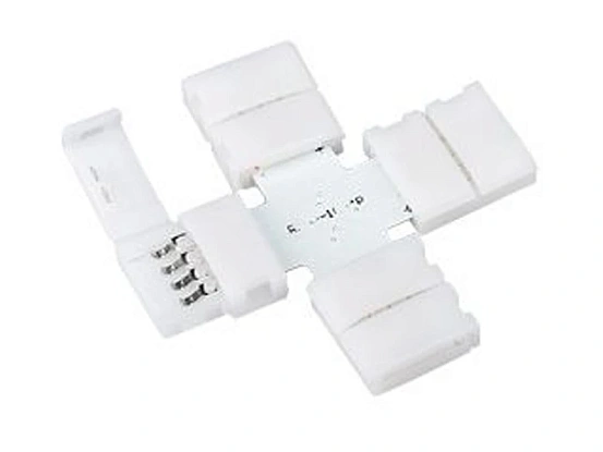 Разветвитель крестовой с разъемами на фиксаторах, для соединения RGB лент шириной 10мм. Максимальный допустимый ток 4А. Не рекомендуется соединять длинные отрезки лент!