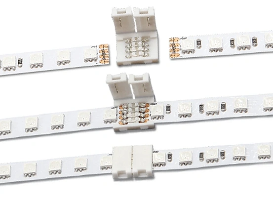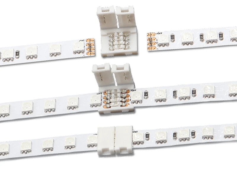 Одиночный коннектор (без провода) для соединения 2-х отрезков открытых светодиодных RGB лент (5060) шириной 10мм. Материал - пластик. Максимальный допустимый ток 3А, напряжение до 50 В. Цена за 1шт.