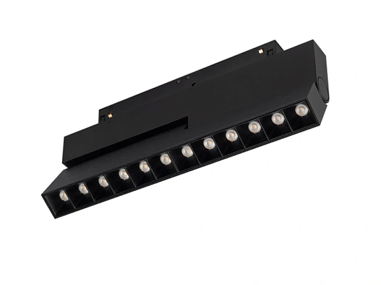 Светильник для магнитных треков MAG-ORIENT шириной 26 мм. Мощность 12 Вт, св. поток 520 лм, 43 лм/Вт, дневной белый 4000 K, теплый белый 3000К, CRI>90, угол 30°, напряжение питания 48 В. Черный прямоугольный корпус из металл, экран поликарбонат, степень защиты IP20. Размер:длина 232 мм, ширина 23 мм, высота 99 мм. Монтаж на трек MAG-ORIENT. Пульсация