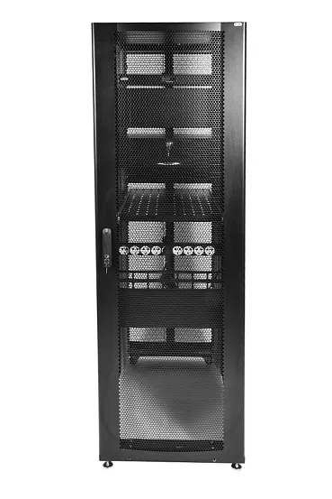 Нижняя часть – полая, обеспечивающая хороший доступ к коммутациям в подготовленном помещении. В нижней части шкафа можно установить панели различного назначения например, фальшпол ОС-ШТК-СП-х. Так же в нижней части шкафа установлены регулируемые опоры и транспортировочные ролики для перемещения шкафа без оборудования. Предусмотрено крепление основания шкафа к полу кронштейны в базовой поставке крепят шкаф к деревянному поддону. Доступ для монтажа, коммутации и обслуживания оборудования возможен с четырех сторон: через боковые стенки, переднюю и заднюю двери. В базовой комплектации шкаф имеет 4 оцинкованные вертикальные направляющие, регулируемые по глубине. Предусмотрена система заземления провода для заземления всех деталей шкафа входят в комплект поставки. Тыльная часть шкафа стандартно комплектуется вертикальными кабельными органайзерами шириной 116 мм, перфорированными для удобства размещения блоков розеточных PDU, укладки и фиксации кабелей. В организаторах предусмотрена система отверстий для быстрой безинструментальной установки и снятия различных типов блоков и оборудования.