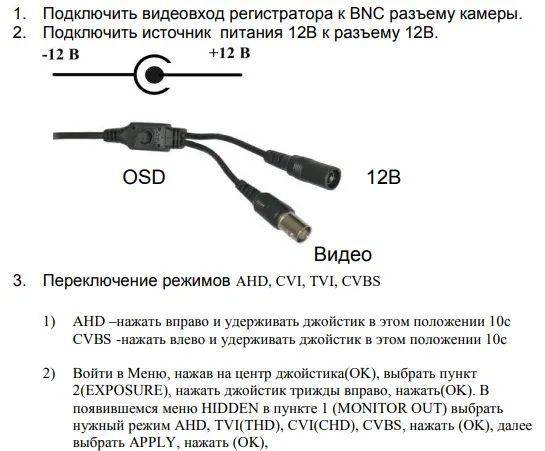 - Режимы работы: AHD / CVI / TVI 1920x1080 при 25к/с / CVBS 960H при 25к/с