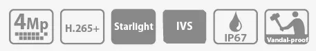 Режим поворота, WDR, 3D DNR, HLC, BLC, технология цифровых водяных знаков. Интеллектуальное обнаружение: контроль области, пересечение линии. Обнаружение нарушений: обнаружение движения, закрытие объектива, отсутствие SD-карты. SD-карта до 256 Гб. Поддержка питания DC 12 В/POE. Класс защиты IP67, IK10.