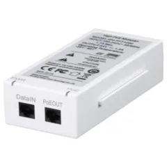 Модель обладает общим количеством портов 2: 1 порт RJ-45 Data In 10/100/1000 Мбит/с для IP-устройств и 1 порт RJ-45 PoE+ Data Out 10/100/1000 Мбит/с для монтажа с компьютером или коммутатором. Корпус из пластика белого цвета крепится на стену. Потребляемая мощность: 60 Вт.