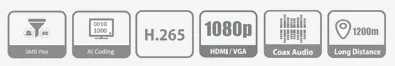 4-канальный HDCVI-видеорегистратор c SMD. Формат видеосигнала: HDCVI, AHD, TVI, IP, CVBS. Отображение: до 1080p, запись: до 1080N25к/с, кодирование: AI-Coding, H.265+, H.265, H.264+, H.264. IP-каналы: до 5 каналов до 6Мп. Накопители: 1 SATA III до 6Тбайт. Видеоаналитика: 4кн интеллектуальный детектор движения SMD Plus, интеллектуальный поиск, 1 HDMI, 1 VGA, сеть: 1 RJ45 100Мбит/с. Аудиовх/вых: 1/1. Питание: 12В(DC).