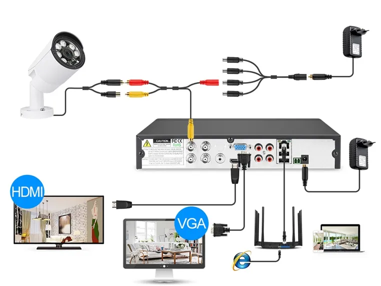 Комплект включает в себя видеорегистратор AHD + 4 внешние видеокамеры 4K (2688х1520), которые прекрасно подойдут к интерьеру любого помещения, блок питания, соединительный кабель и все необходимые аксессуары. Наблюдать вы можете из любой точки мира через интернет с помощью компьютера, планшета или смартфона. Простота подключения обеспечивается облачной технологией P2P.