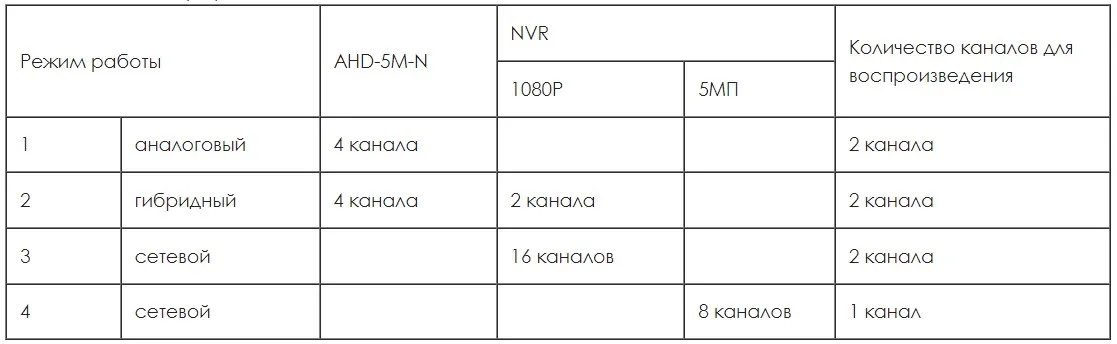 - Гибридный режим: 4 камер 5M-N AHD/TVI/CVI/XVI + 2 IP-камеры 1080P