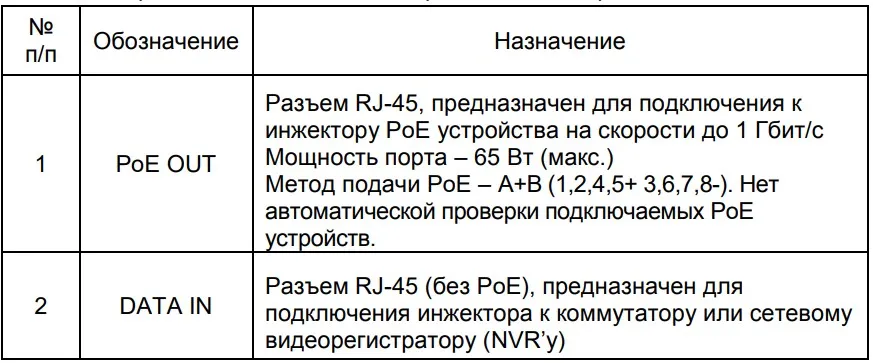 - Совместимые устройства: Cовместим с оборудованием PoE IEEE 802.3af/at/bt. Без автоматического определения PoE нагрузки.