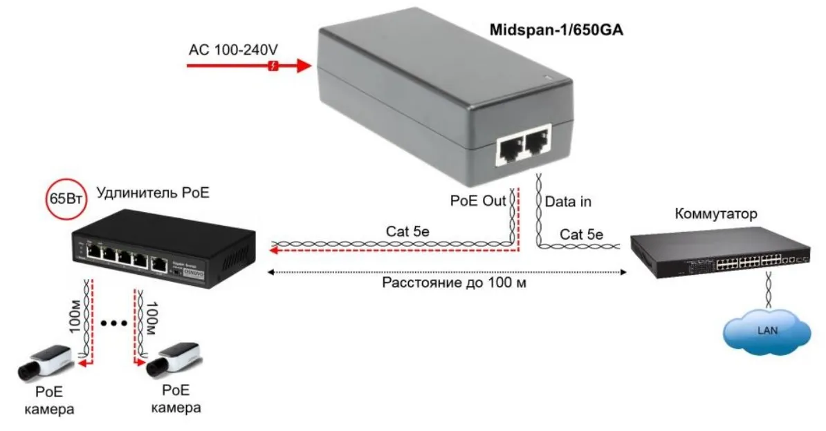 Типовая схема подключения инжектора Midspan-1/650GA с удлинителем с питанием по PoE