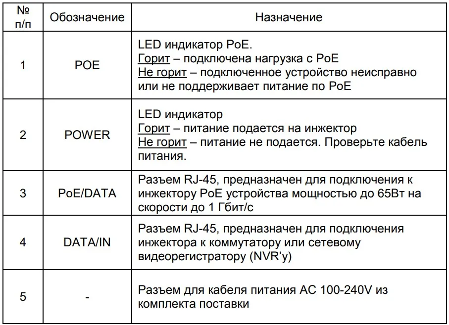 Максимальная мощность PoE на порт – 65 Вт. Скорость портов инжекторов – 1 Гбит/с (10/100/1000 BaseT). Питание производится от сети AC 100-240V.