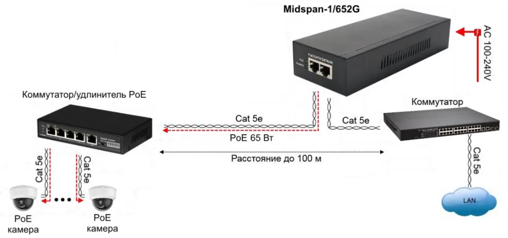 Типовая схема подключения инжектора Midspan-1/652G вместе с PoE коммутатором/удлинителем