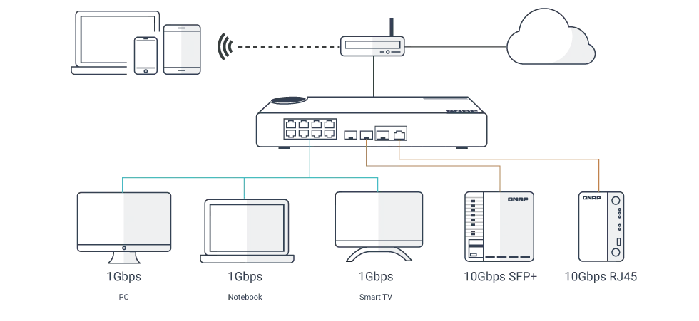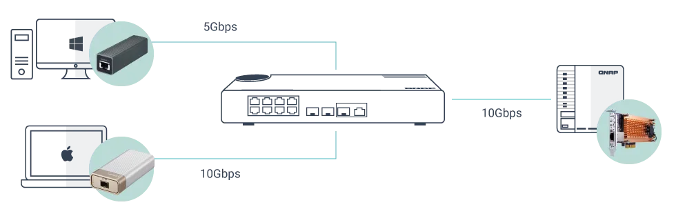 QNAP предлагает широкий спектр сетевых устройств, с помощью которых корпоративные и домашние пользователи могут построить инфраструктуру хранения и обмена данными через соединения на скорости 10 Гбит/с. Через адаптер-переходник от Thunderbolt 3 к 10GbE можно подключить компьютеры, ноутбуки и другие устройства без встроенных сетевых портов.
