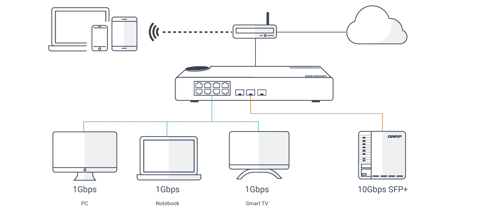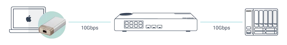QNAP предлагает широкий спектр сетевых устройств, с помощью которых корпоративные и домашние пользователи могут построить инфраструктуру хранения и обмена данными через соединения на скорости 10 Гбит/с. Через адаптер-переходник от Thunderbolt 3 к 10GbE можно подключить компьютеры, ноутбуки и другие устройства без встроенных сетевых портов.
