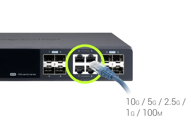| Поддержка комбированных портов 10GbE SFP + / RJ45 позволяет использовать существующую медную инфраструктуру и обеспечивает обратную совместимость со скоростями 5 / 2,5 / 1 / 0,1 Гбит/с | |