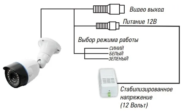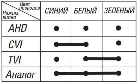 Переключение режимов работы камеры осуществляется путем соединения проводов в соответствии с таблицей