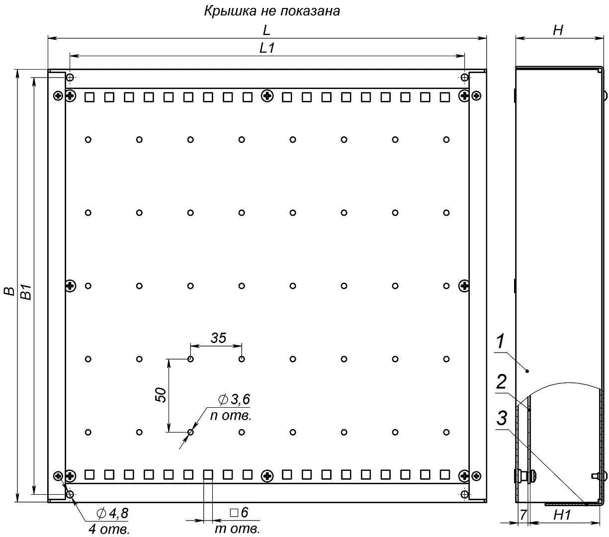 | Наименование коробки монтажной | L, мм | L1, мм | B, мм | B1, мм | H, мм | H1, мм |