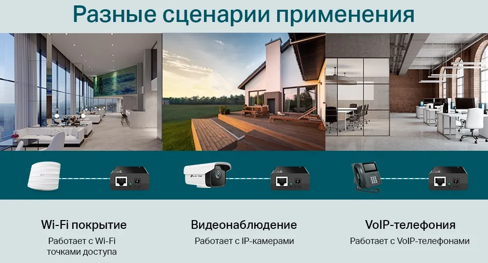 Инжектор PoE TL-POE150S поддерживает стандарт IEEE 802.3af и может работать со всеми устройствами на базе IEEE 802.3af, питаемыми по PoE, а также сплиттерами (включая TL-POE10R и прочие эквивалентные устройства) с целью развёртывания вашей сети в тех местах, где отсутствуют электрические розетки, и где вам может понадобиться установка таких устройств, как точки доступа, IP-камеры, IP-телефоны и т.д.