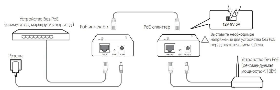 - На выходе: 48 В, 0,5 A, переключающий блок питания - Выходная мощность PoE-сплиттера: 12/9/5 В пост. тока