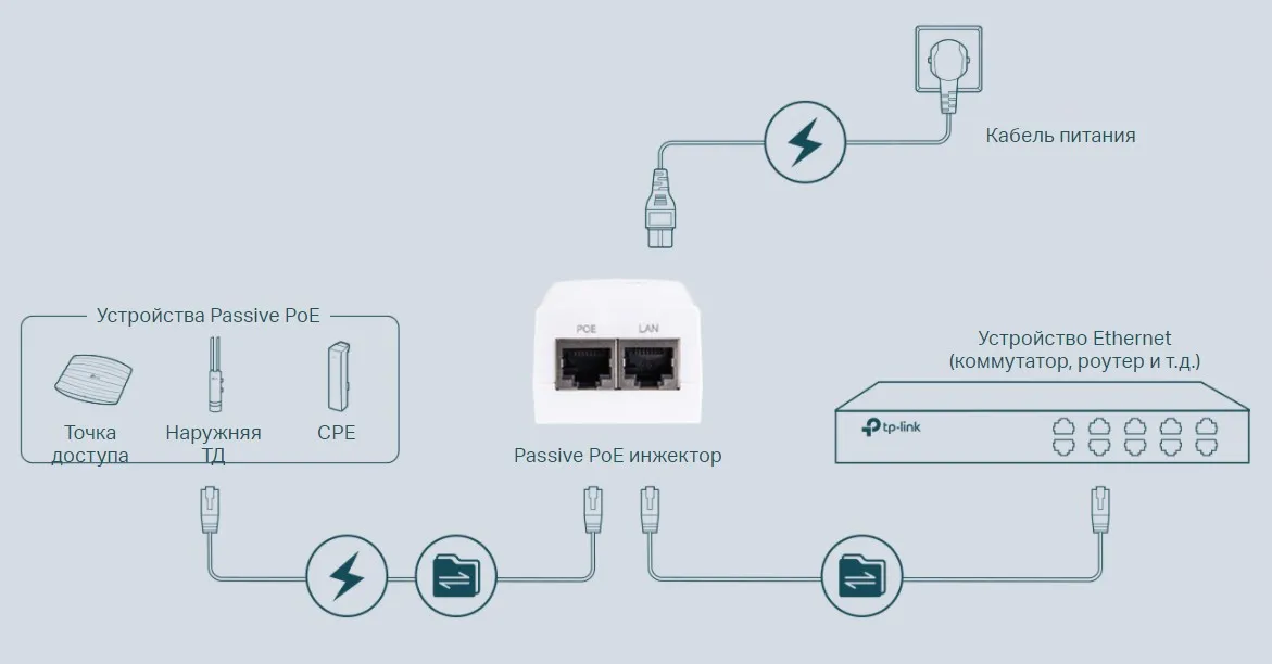 Используйте адаптер Passive PoE TL-POE2412G для одновременной передачи данных и питания к устройствам с поддержкой Passive PoE.