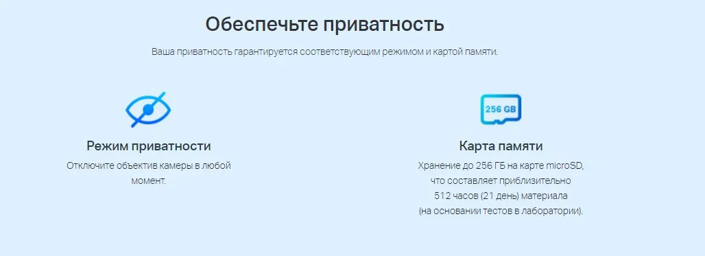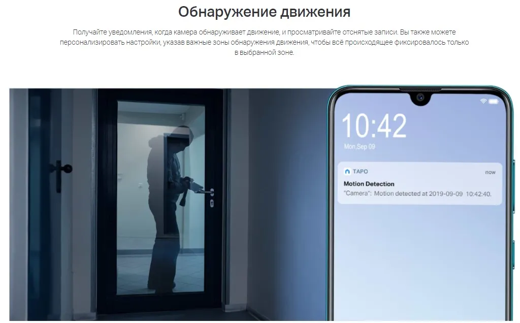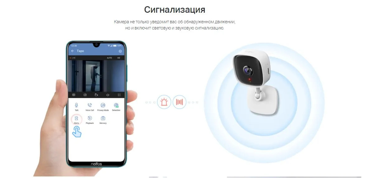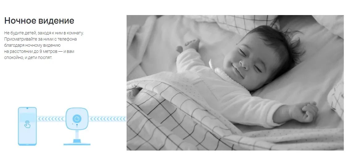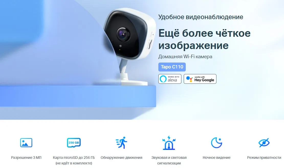 Внутренняя Wi‑Fi камера. Видео в высоком разрешении (3 МП). Ночное видение на расстоянии до 9 метров. Push-уведомления на смартфон при обнаружении движения. Звуковая и световая сигнализация для незваных гостей. Встроенный микрофон и динамик. Хранение до 256 ГБ на карте microSD приблизительно 512 часов (21 день) материала (на основании теста в лаборатории). Простая настройка и управление с помощью приложения Tapo.