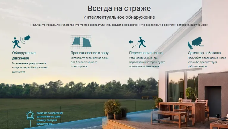 - Интеллектуальное обнаружение (движения, пересечения линии, проникновения в охраняемую зону и детектор саботажа): отправка уведомлений, когда кто-то пересекает линию, проникает в охраняемую зону или препятствует работе камеры.