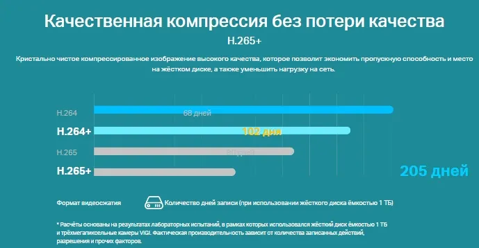 - H.265+: кристально чистое компрессированное изображение без потери качества, которое позволит экономить пропускную способность и место на жёстком диске, а также уменьшить нагрузку на сеть.