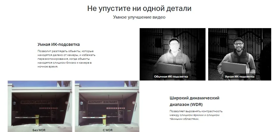 - Умная ИК-подсветка: позволит разглядеть объекты, которые находятся далеко от камеры или слишком близко к камере в ночное время.
