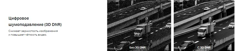 - Цифровое шумоподавление (3D DNR): снижает зернистость изображения и повышает чёткость видео.