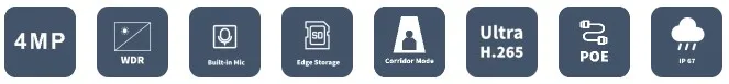 Коридорный режим 9:16. Разъем для карт памяти: micro SD до 256 гб. Интеграция: ONVIF, API. Минимальная освещенность: 0.003Lux, c ИК 0Lux. Класс защиты: IP67. Температура эксплуатации: -40C до +60C. Питание: 12V DC ±, 25%, PoE. Потребляемая мощность: 8 Вт. Металлический корпус. Вес: 0.55 кг. Размеры (Д х Ш х В): 206 x 74 x 74 мм .