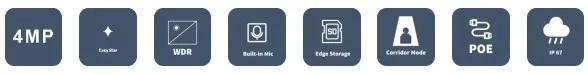 Технология Easystar обеспечивает высокое качество изображения в среде с низкой освещенностью. WDR 120dB обеспечивает четкое изображение. Поддержка режима коридора 9:16. Встроенный микрофон. Интеллектуальный ИК-дисплей, до 30 м (98 футов). Поддержка 256 G Micro SD-карты. Защита IP67. Поддержка 12V, PoE (IEEE802.3 af).