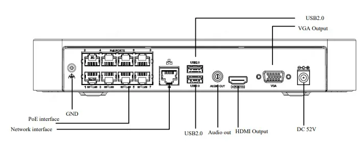 Сетевой 8-ми канальный видеорегистратор с 8-ю PoE портами 30W на каждый порт с максимальной нагрузкой не более 75W. Видеовыходы на внешние мониторы: HDMI/ VGA. Формат сжатия: Ultra 265/H.265/H.264.