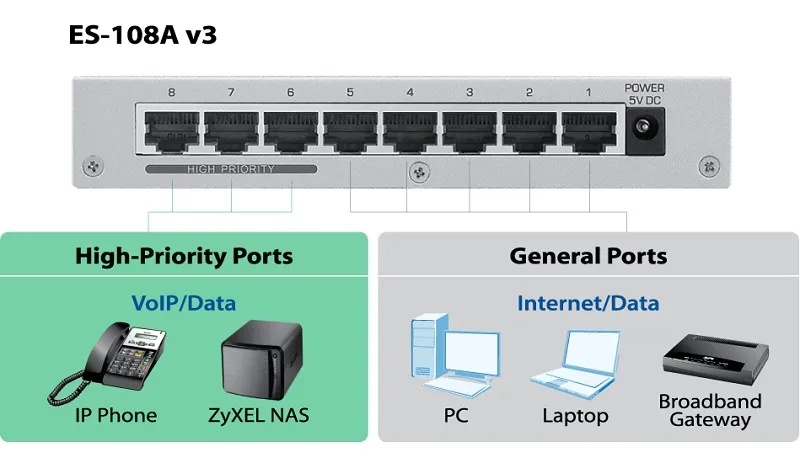 Zyxel ES-108A v3 v3 оборудован двумя портами с повышенным приоритетом High Priority. Благодаря функции QoS на уровне портов ES-108A v3 существенно улучшаетcя скорость загрузки. Приоритетные настройки полосы пропускания обеспечивают повышенную производительность при просмотре Web-страниц, в онлайновых играх и при потоковом воспроизведении мультимедиа. Увеличенный объем буфера памяти ES-108A v3 помогает коммутатору стабильно обрабатывать пакеты при сильном сетевом трафике.