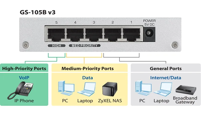 GS-105B v3 оборудован 3 портами QoS со встроенным механизмом high-priority и medium-priority для стабильной работы VoIP и обмена данными. Если присоединить к этим портам IP-телефон, компьютер или сетевое хранилище, то вы получите высокое качество связи VoIP и обмена данными.