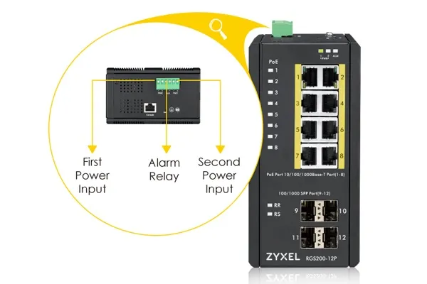 RGS200-12P оборудован двумя разъемами для подачи питания постоянного тока и поэтому обеспечивает высокую доступность и отказоустойчивость даже при самых экстремальных условиях. Если коммутатор используется вне помещений, то функция защиты обратной мощности