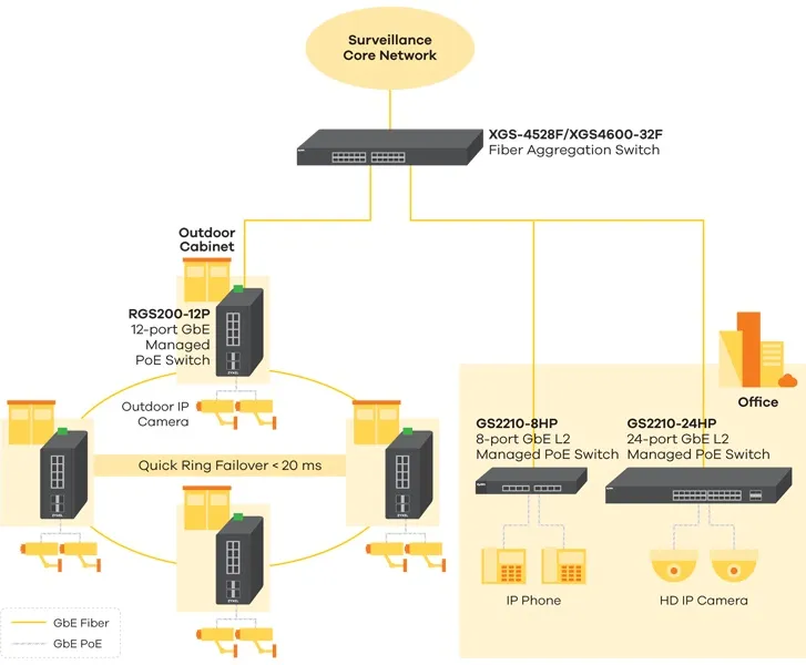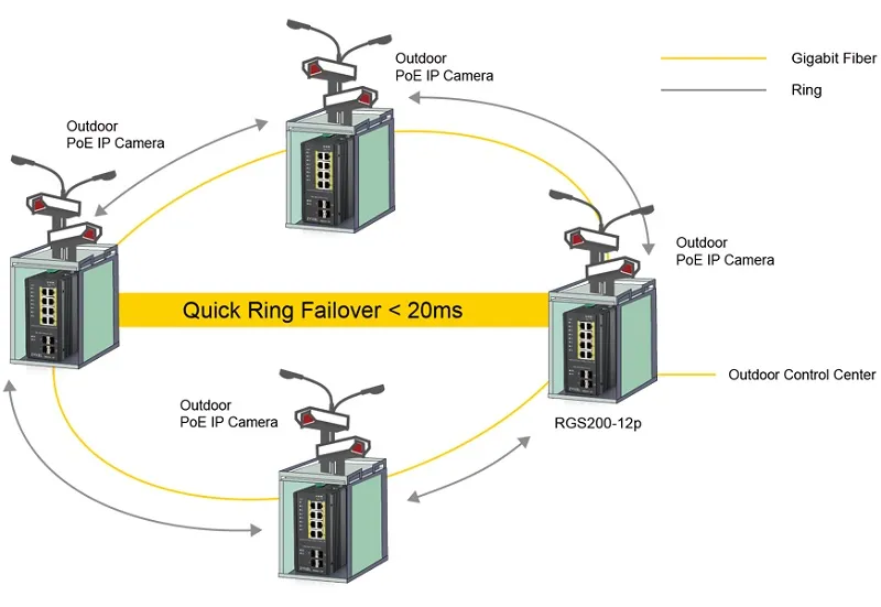 С помощью коммутатора Zyxel RGS200-12P можно построить отказоустойчивую сеть с топологией резервированного кольца, которая будет автоматически восстанавливаться при сбое для предотвращения обрыва соединения. В случае сбоя из-за ошибки в сети быстрое переключение на резервное кольцо восстановит нормальную работу сети меньше чем за 20 мсек. Кроме того, для управления RGS200-12P используется удобный GUI-интерфейс на базе браузера.