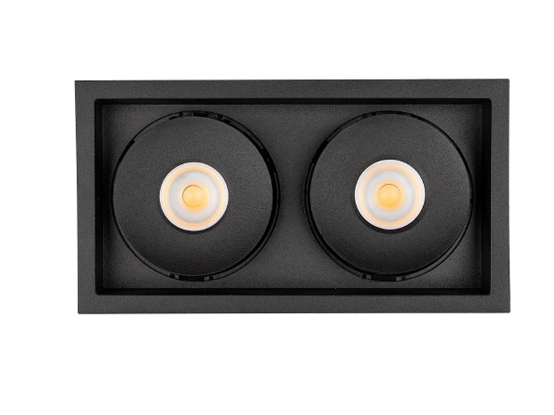Встраиваемый поворотный светильник для потолка. Мощность 2x9W, цвет теплый белый 3000K, дневной белый 4000К, св.поток теплый белый 1260лм, св.поток дневной белый 1260лм, угол 45°, RA>90. Корпус прямоугольный черный. Питание AC180-240V. Размеры LxWxH 148x80x90мм. Установка в отверстие 140x70мм. Драйвер в комплекте (30-45V, 220mA).