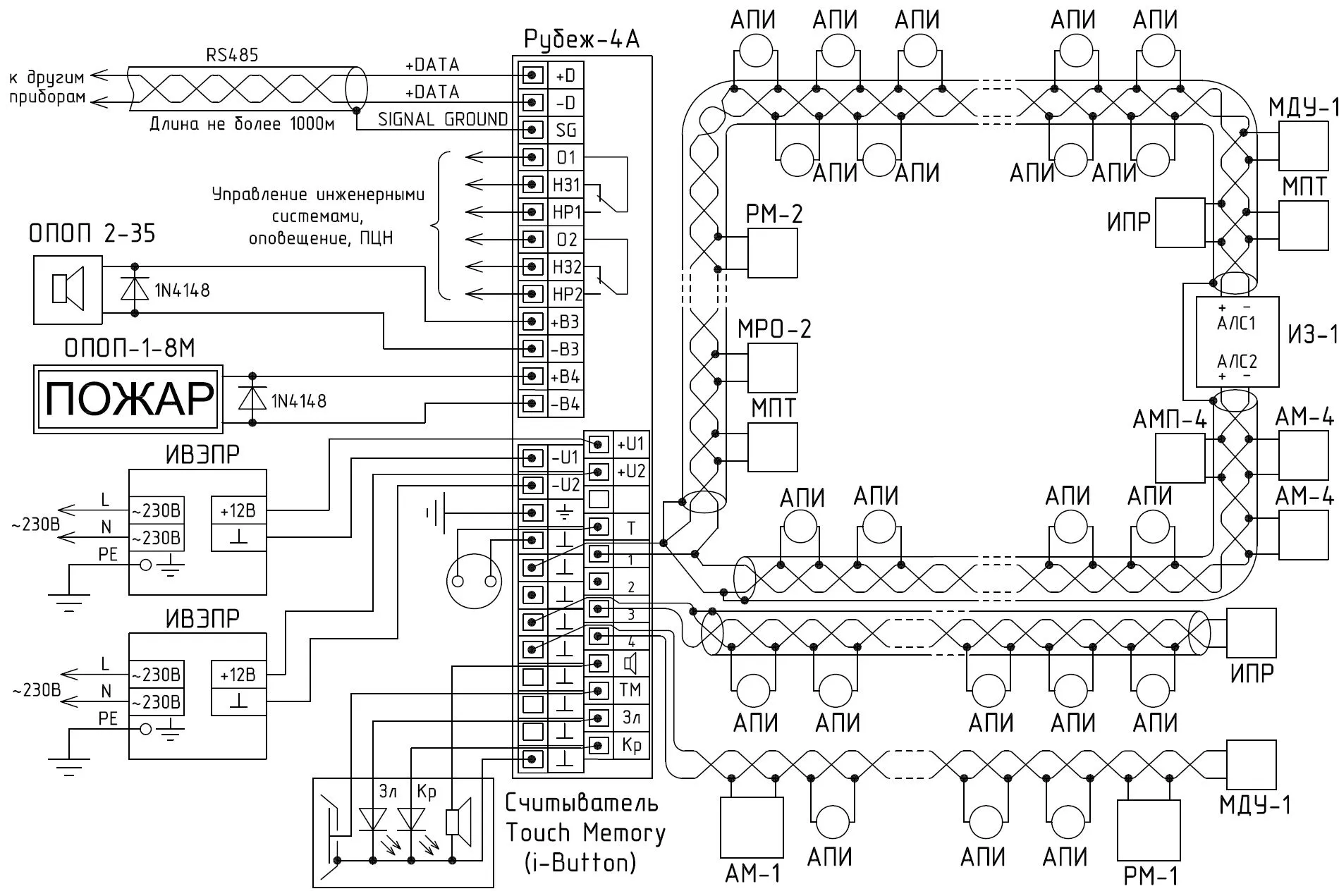 После конфигурирования системы, адресный пожарный прибор РУБЕЖ-4А может управлять адресной системой пожарной сигнализации автономно.