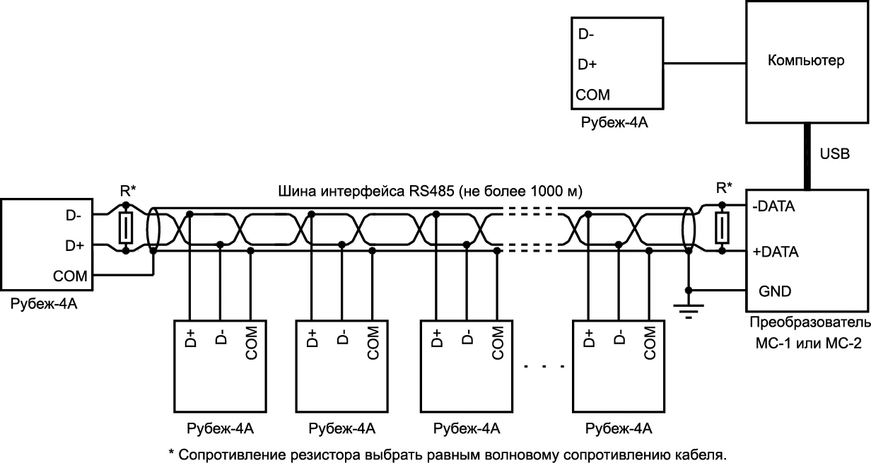Подключение одного прибора к компьютеру можно производить при помощи преобразователя интерфейсов RS485/USB либо USB-кабеля. Прибор РУБЕЖ-4А может комплектоваться USB-кабелем (по отдельному заказу).