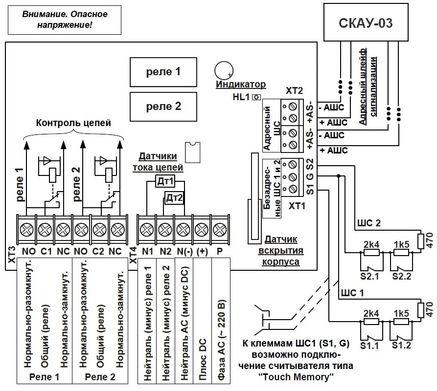 Дополнительно имеются два безадресных шлейфа сигнализации (ШС 1, 2) для подключения датчиков (извещателей) с нормально-замкнутыми (нормально- разомкнутыми) контактами. К клеммам ШС1 возможно подключение считывателя типа «Touch Memory».
